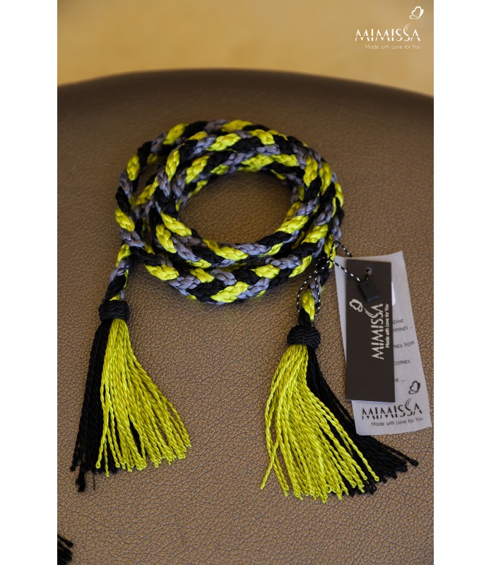 Cord of black, dark grey and sulfur yellow silk threads, hand braided to tie.