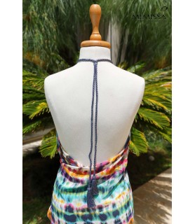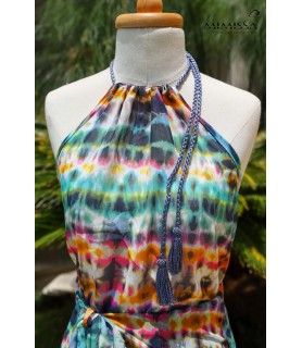 A printed dress tied to the neck with a grey handmade silk drawstring.